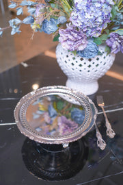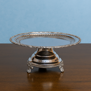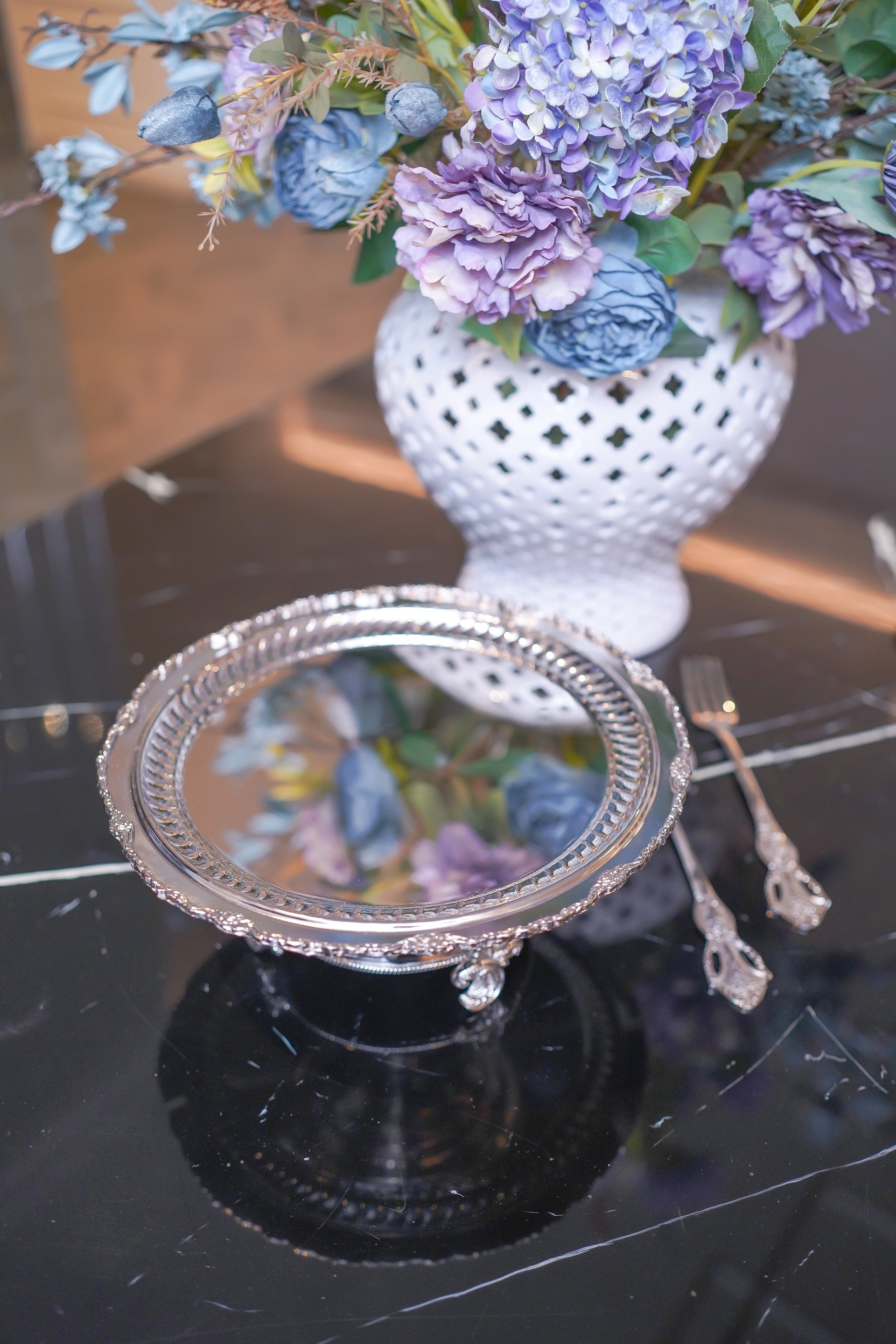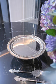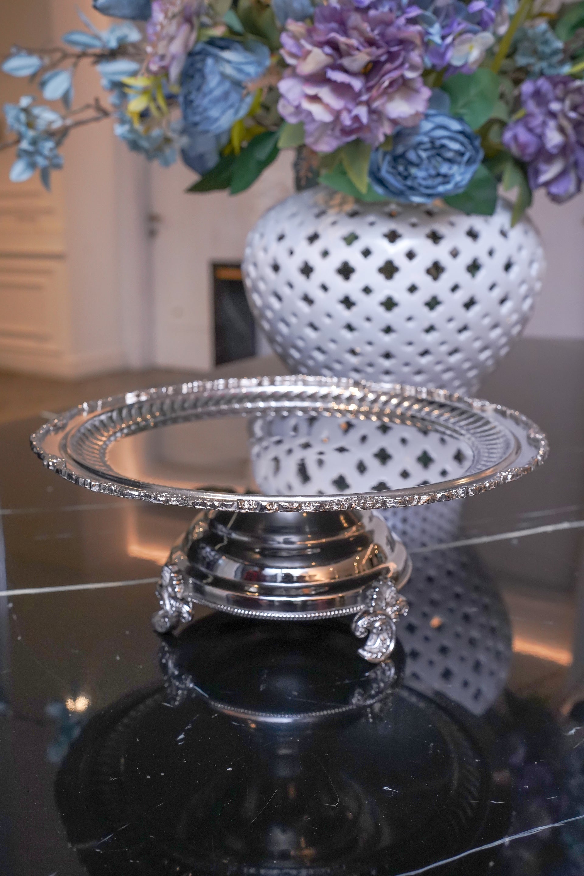 This elegant silver cake stand features a charming chameli design along the edge, adding a touch of sophistication to your dessert display.
