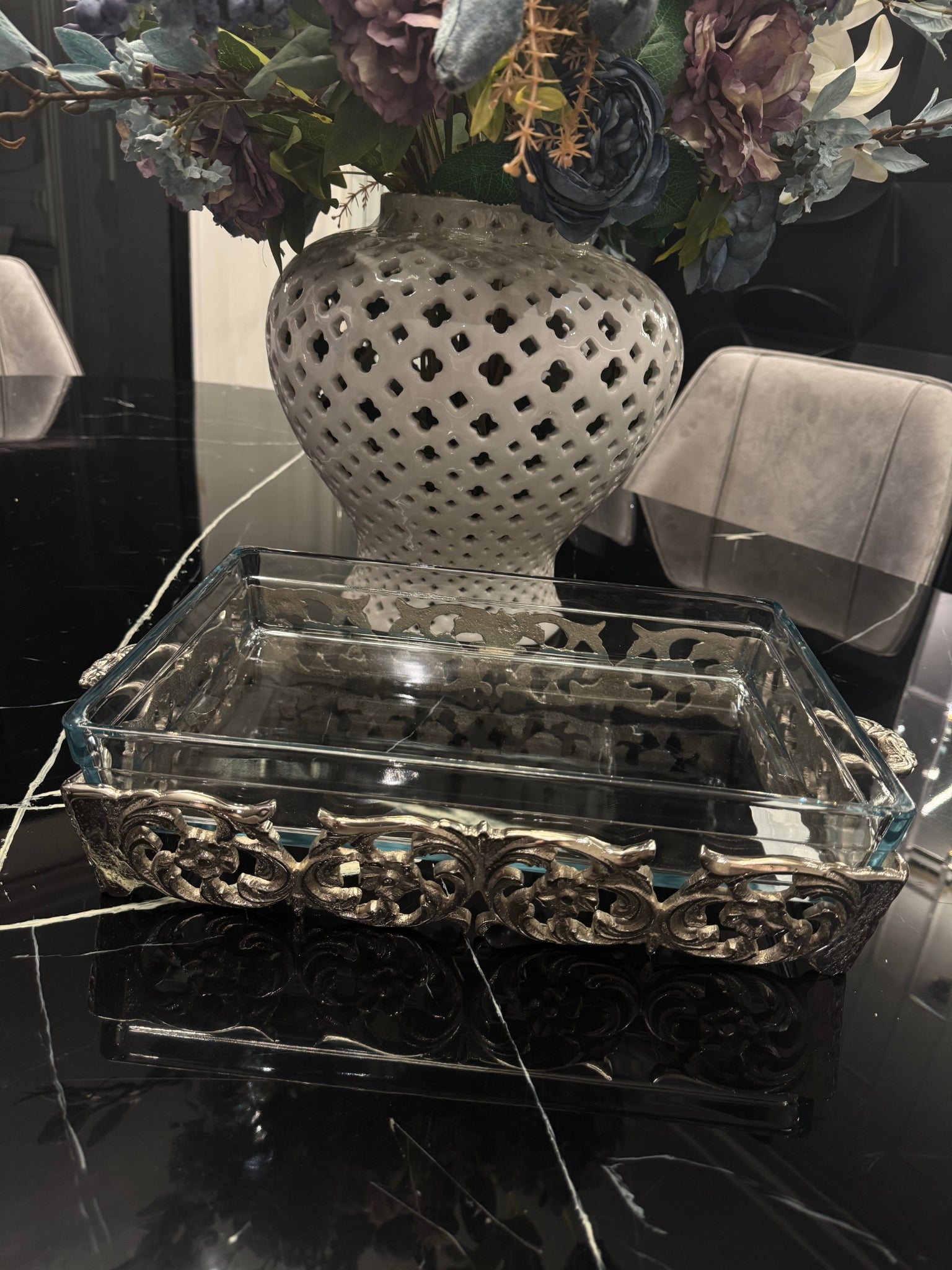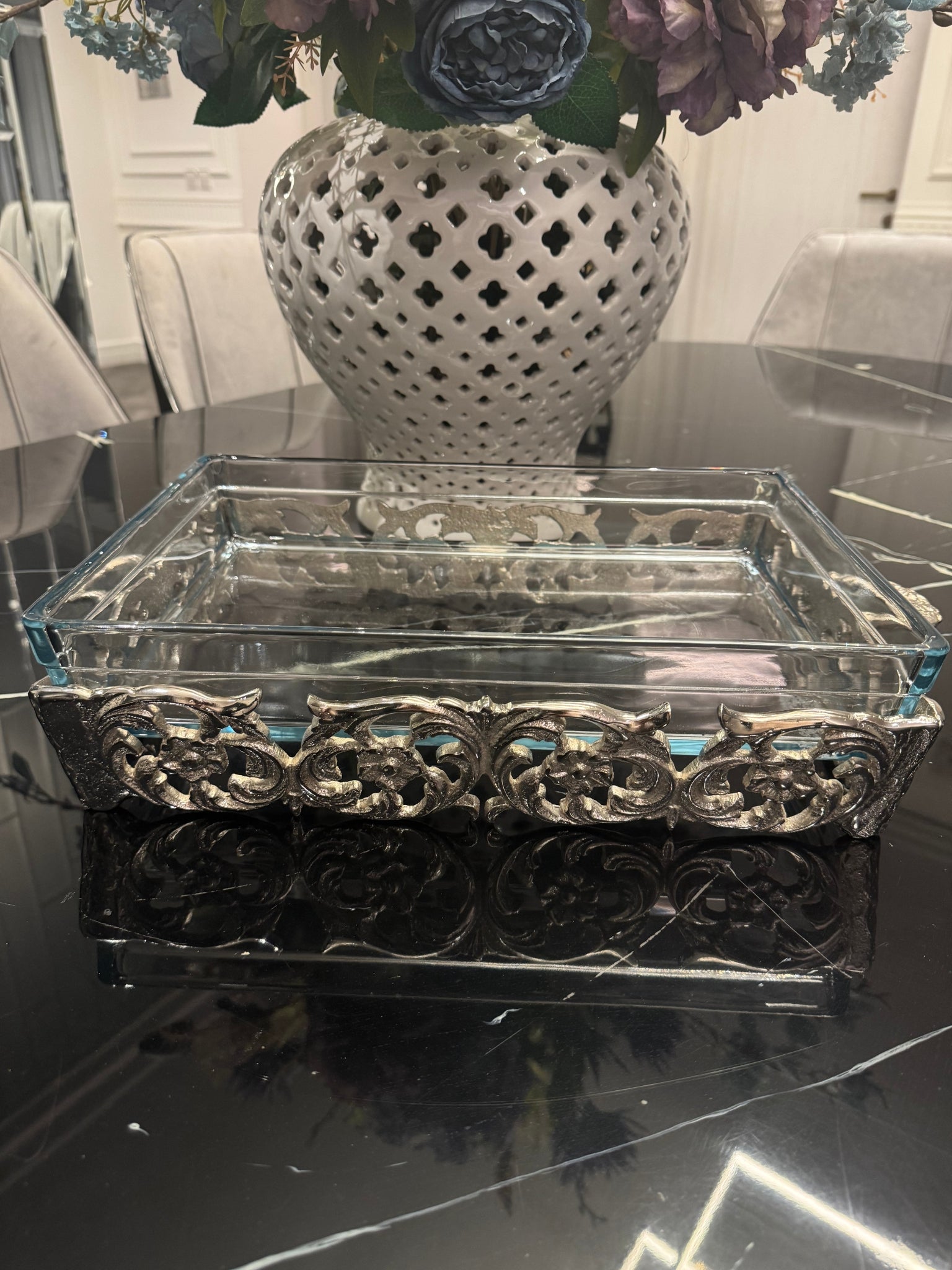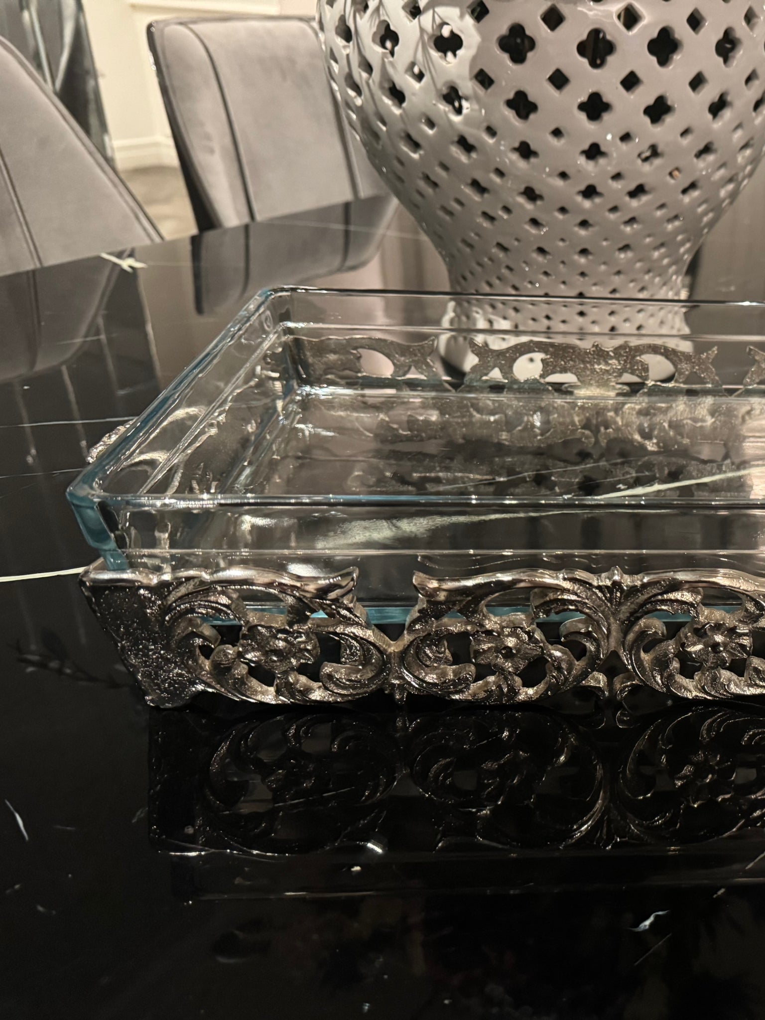 Enhance your dining experience with our beautifully crafted serving dishes, available in two sizes. Each piece is handmade from plated brass with a stunning glass insert, designed to add a touch of sophistication to your table settings.